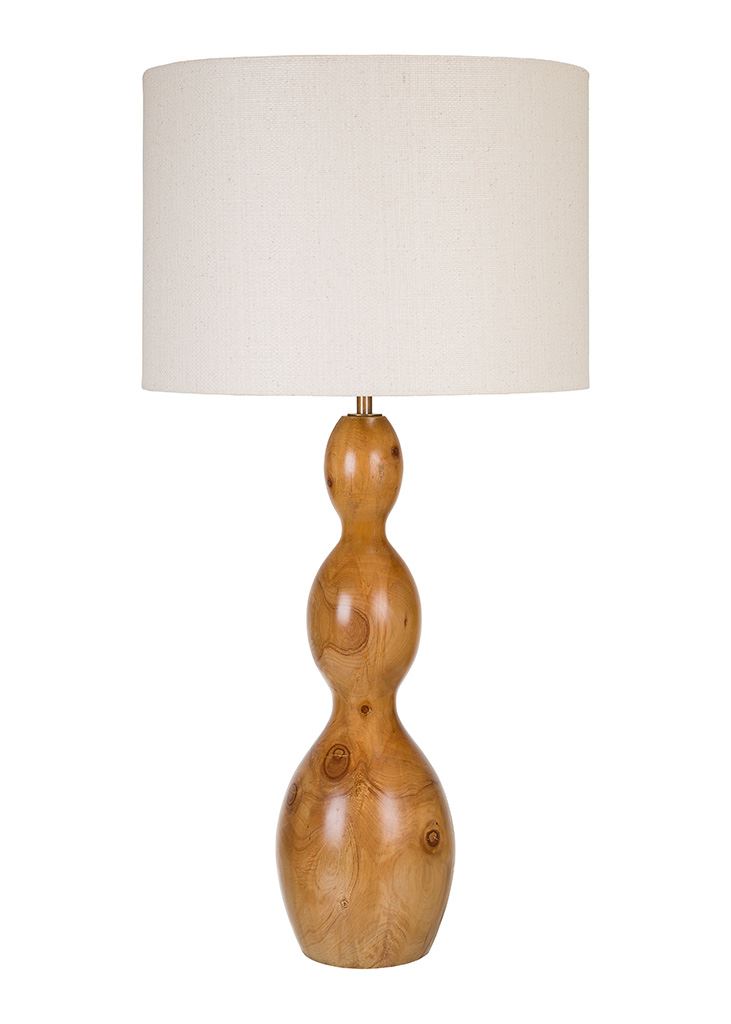 Abatjour de mesa em madeira de reflorestamento na tonalidade marfim e cúpula redonda em linho rústico.
